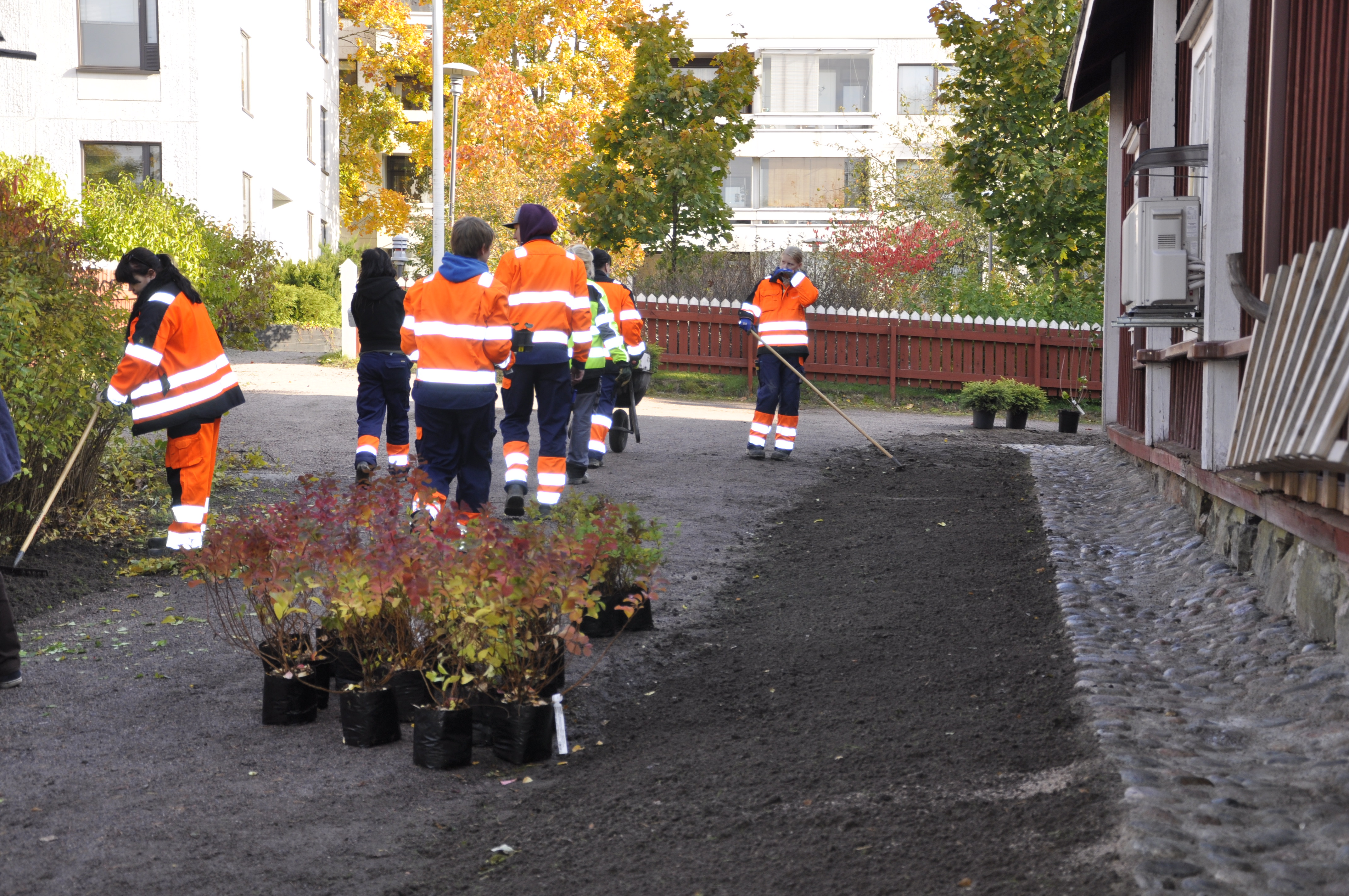 Opiskelijat tekivät opiskelijatyönä, opettajansa ohjeistuksella istutussuunnitelman talon henkeen sopivista perinteikkäistä kasveista ja suunnitelma toteutettiin lokakuun alussa. Piha näyttää jo nyt hienolta, vaikka muutama vuosihan siinä menee, että lopullisesta ilmeestä päästään nauttimaan.