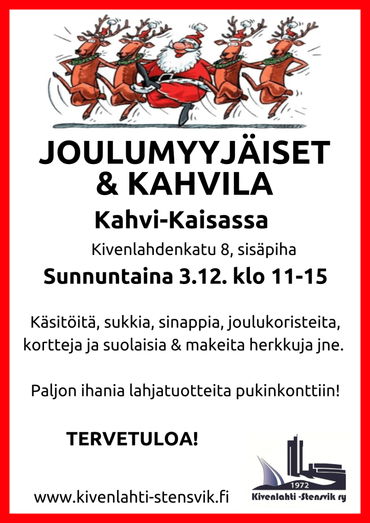 Joulumyyjäiset & Kahvila Jaa tämä: Click to share on X(Avautuu uudessa ikkunassa) X Jaa Facebookissa(Avautuu uudessa ikkunassa) Facebook Tykkää Lataa... Aiheeseen liittyy