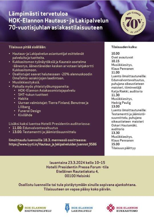 Me HOK-Elannon Hautaus- ja Lakipalvelussa juhlimme tänä vuonna 70-vuotista taivaltamme.