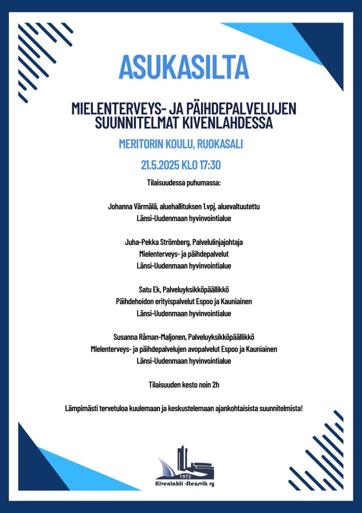 Järjestämme Meritorin koululla asukasillan, jossa keskustellaan Mielenterveys- ja päihdepalvelujen suunnitelmista ja tulevaisuudesta Kivenlahdessa.