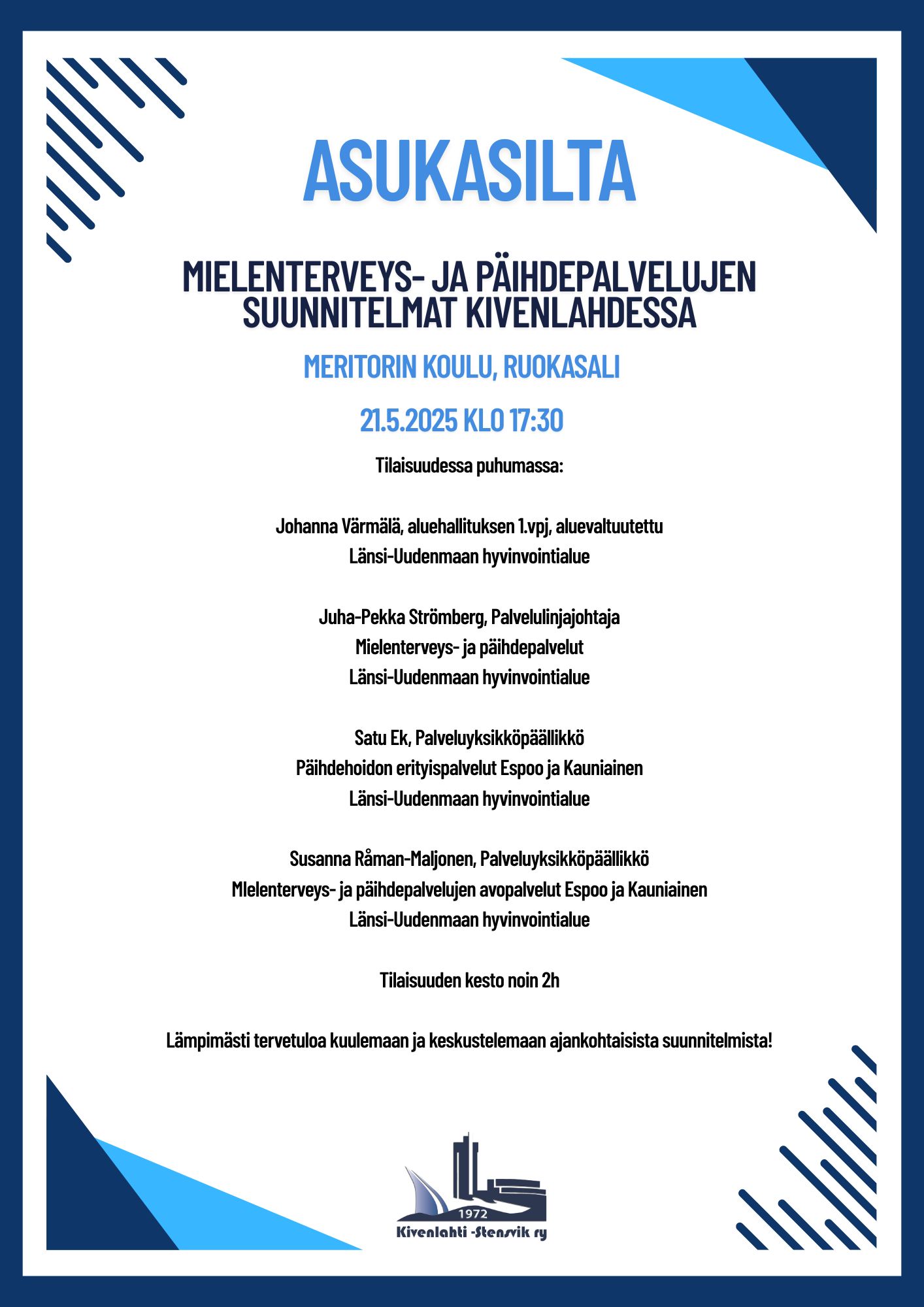 Järjestämme Meritorin koululla asukasillan, jossa keskustellaan Mielenterveys- ja päihdepalvelujen suunnitelmista ja tulevaisuudesta Kivenlahdessa.