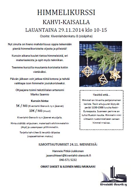 Himmelikurssi 29.11.2014 Ilmoittautuminen päättynyt! Jaa tämä: Click to share on X(Avautuu uudessa ikkunassa) X Jaa Facebookissa(Avautuu uudessa ikkunassa) Facebook Tykkää Lataa...
