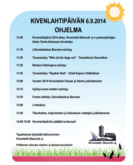 Kivenlahtipäivän 2014 ohjelma Jaa tämä: Click to share on X(Avautuu uudessa ikkunassa) X Jaa Facebookissa(Avautuu uudessa ikkunassa) Facebook Tykkää Lataa...